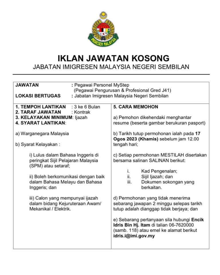 Iklan Jawatan Jabatan Imigresen Malaysia Negeri Sembilan