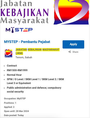Permohonan jawatan ini boleh dibuat melalui Portal MyFutureJobs. Sila ke Portal MyFutureJobs dan Masukkan Kata Carian yang ingin dicari “Jabatan Kebajikan Masyarakat (JKM)” di bahagian carian untuk memohon jawatan yang diiklankan.
