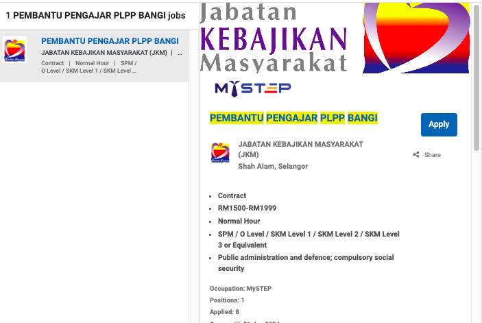 Permohonan jawatan ini boleh dibuat melalui Portal MyFutureJobs. Sila ke Portal MyFutureJobs dan Masukkan Kata Carian “PEMBANTU PENGAJAR PLPP BANG” di bahagian carian untuk memohon jawatan yang diiklankan.