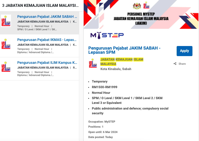 Permohonan jawatan ini boleh dibuat melalui Portal MyFutureJobs. Sila ke Portal MyFutureJobs dan Masukkan Kata Carian yang ingin dicari “JABATAN KEMAJUAN ISLAM MALAYSIA” di bahagian carian untuk memohon jawatan yang diiklankan.