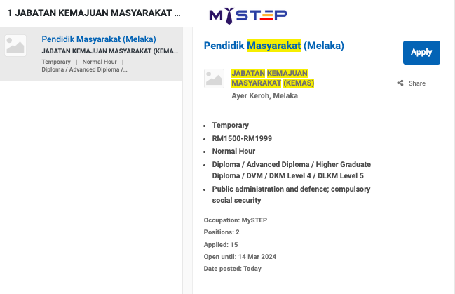 Permohonan jawatan ini boleh dibuat melalui Portal MyFutureJobs. Sila ke Portal MyFutureJobs dan Masukkan Kata Carian yang ingin dicari “JABATAN KEMAJUAN MASYARAKAT (KEMAS)” di bahagian carian untuk memohon jawatan yang diiklankan.