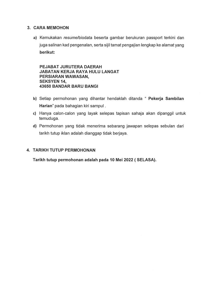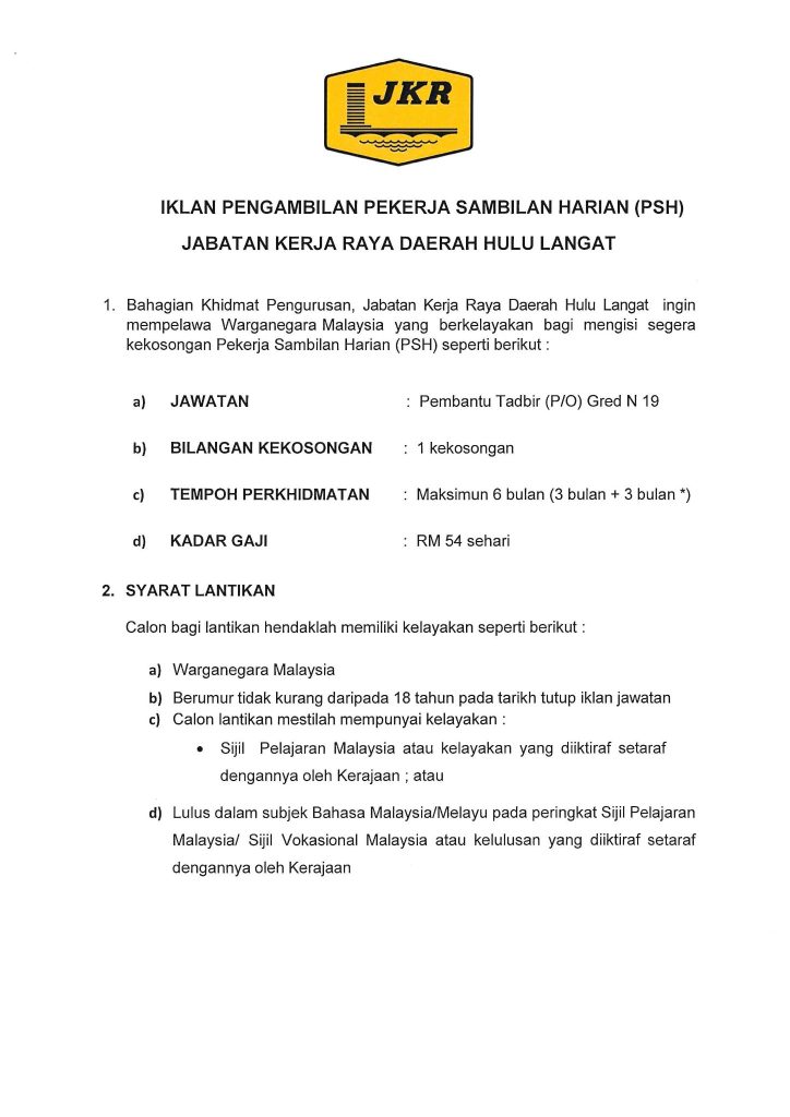 Iklan Jawatan Jabatan Kerja Raya (JKR) Daerah Hulu Langat