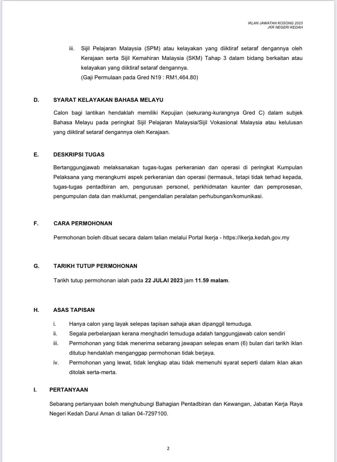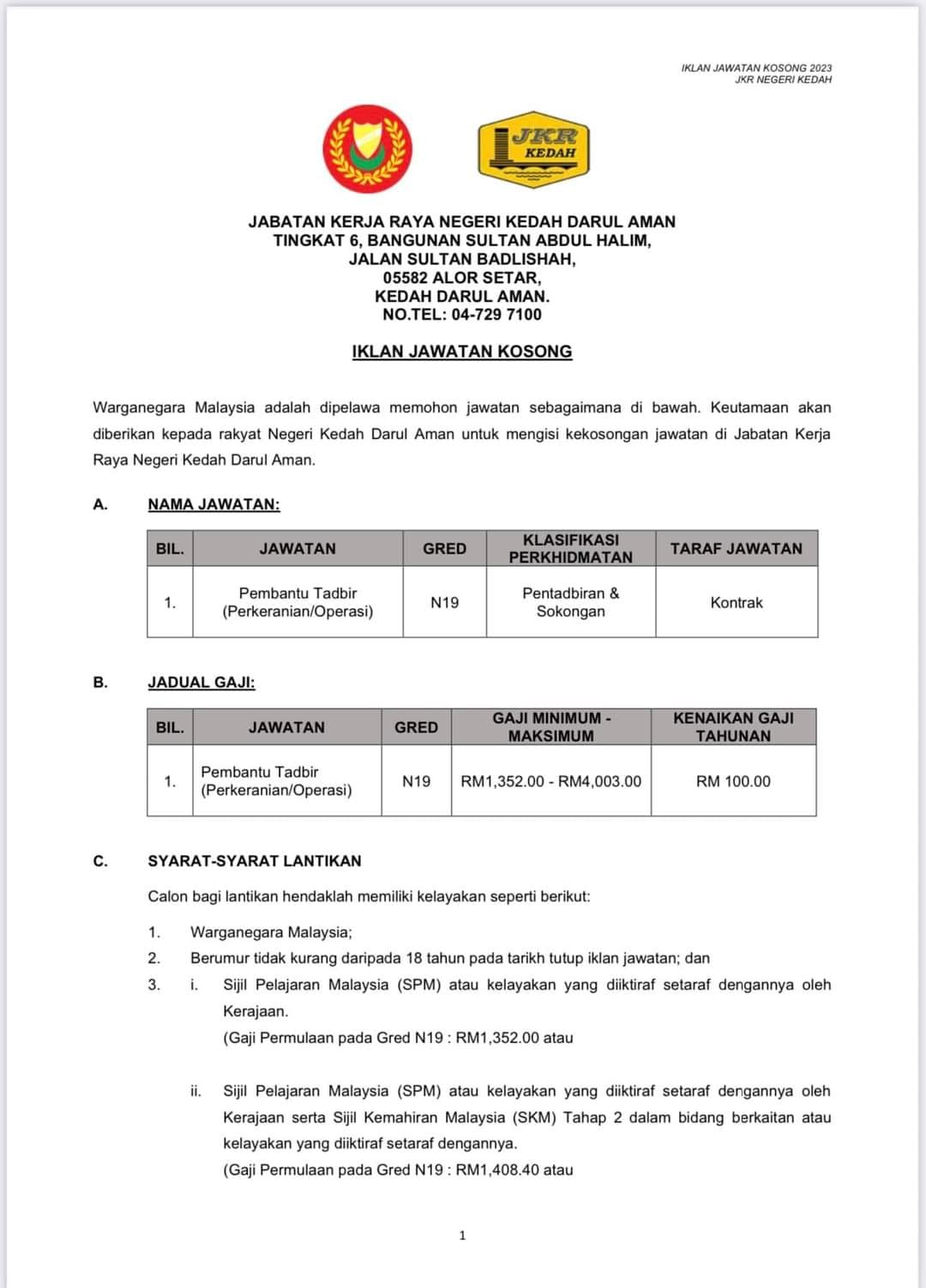 Iklan Jawatan Jabatan Kerja Raya (JKR) Negeri Kedah