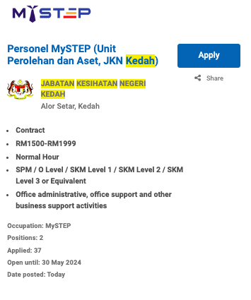 Permohonan jawatan ini boleh dibuat melalui Portal MyFutureJobs. Sila ke Portal MyFutureJobs dan Masukkan Kata Carian yang ingin dicari “JABATAN KESIHATAN NEGERI KEDAH” di bahagian carian untuk memohon jawatan yang diiklankan.