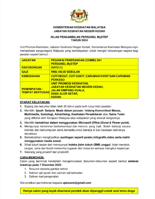 Iklan Jawatan Jabatan Kesihatan Negeri Kedah