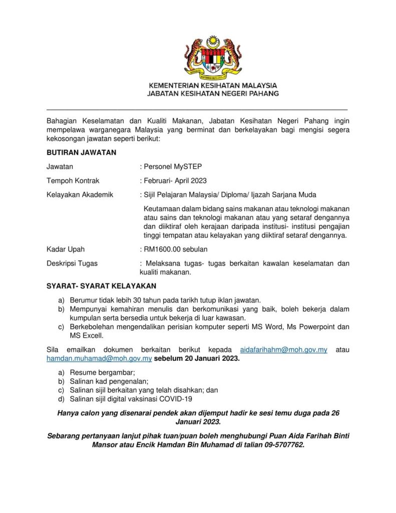 Iklan Jawatan Jabatan Kesihatan Negeri Pahang