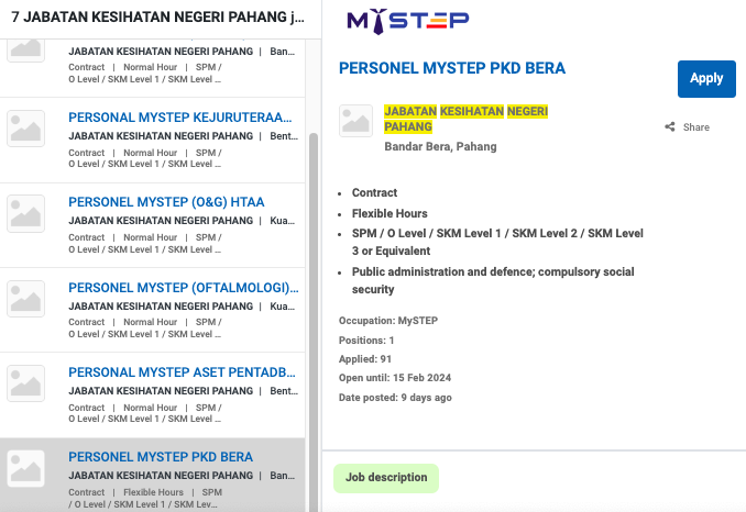 Permohonan jawatan ini boleh dibuat melalui Portal MyFutureJobs. Sila ke Portal MyFutureJobs dan Masukkan Kata Carian “JABATAN KESIHATAN NEGERI PAHANG” di bahagian carian untuk memohon jawatan yang diiklankan.