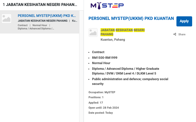 Permohonan jawatan ini boleh dibuat melalui Portal MyFutureJobs. Sila ke Portal MyFutureJobs dan Masukkan Kata Carian yang ingin dicari “JABATAN KESIHATAN NEGERI PAHANG” di bahagian carian untuk memohon jawatan yang diiklankan.