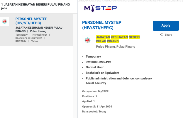 Permohonan jawatan ini boleh dibuat melalui Portal MyFutureJobs. Sila ke Portal MyFutureJobs dan Masukkan Kata Carian yang ingin dicari JABATAN KESIHATAN NEGERI PULAU PINANG di bahagian carian untuk memohon jawatan yang diiklankan.
