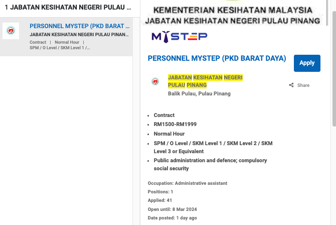 Permohonan jawatan ini boleh dibuat melalui Portal MyFutureJobs. Sila ke Portal MyFutureJobs dan Masukkan Kata Carian yang ingin dicari “JABATAN KESIHATAN NEGERI PULAU PINANG” di bahagian carian untuk memohon jawatan yang diiklankan.