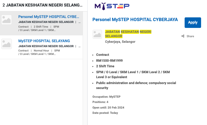 Permohonan jawatan ini boleh dibuat melalui Portal MyFutureJobs. Sila ke Portal MyFutureJobs dan Masukkan Kata Carian yang ingin dicari JABATAN KESIHATAN NEGERI SELANGOR di bahagian carian untuk memohon jawatan yang diiklankan.