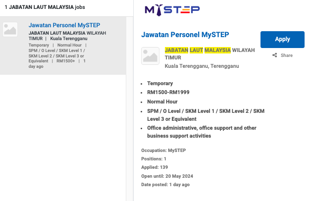 Permohonan jawatan ini boleh dibuat melalui Portal MyFutureJobs. Sila ke Portal MyFutureJobs dan Masukkan Kata Carian yang ingin dicari “JABATAN LAUT MALAYSIA” di bahagian carian untuk memohon jawatan yang diiklankan.