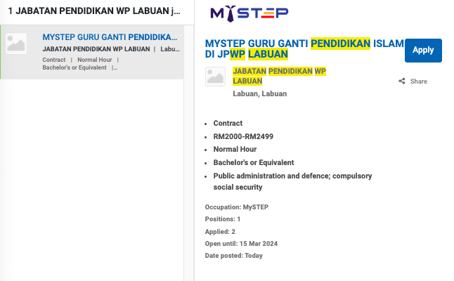 Permohonan jawatan ini boleh dibuat melalui Portal MyFutureJobs. Sila ke Portal MyFutureJobs dan Masukkan Kata Carian yang ingin dicari “JABATAN PENDIDIKAN WP LABUAN” di bahagian carian untuk memohon jawatan yang diiklankan.
