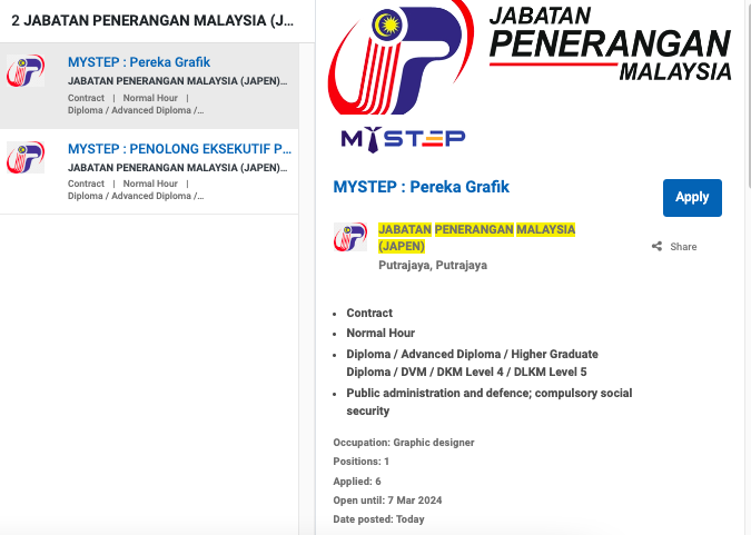 - Setelah mendaftar, anda boleh terus login dan mencari bidang kerjaya yang diinginkan mengikut lokasi yang ditawarkan