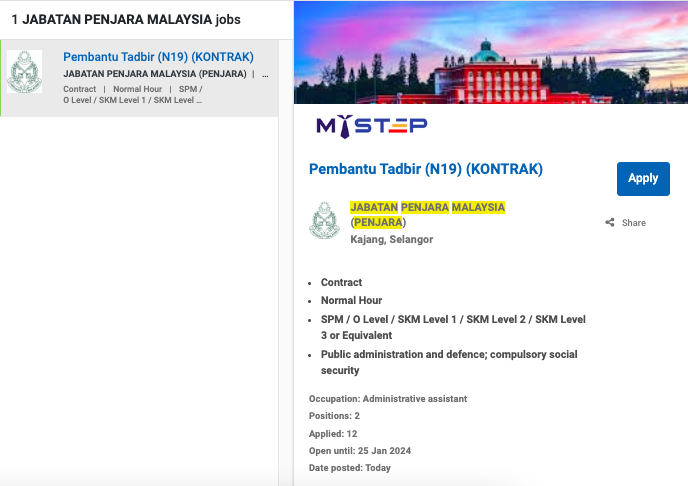 Permohonan jawatan ini boleh dibuat melalui Portal MyFutureJobs. Sila ke Portal MyFutureJobs dan Masukkan Kata Carian “JABATAN PENJARA MALAYSIA (PENJARA)” di bahagian carian untuk memohon jawatan yang diiklankan.
