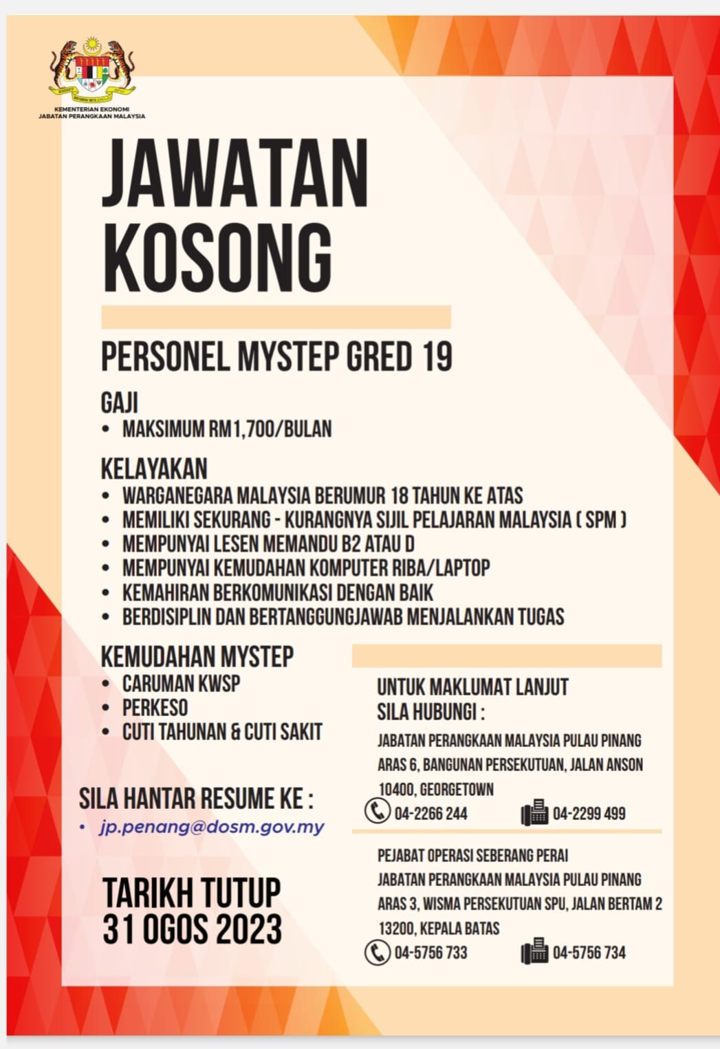 Iklan Jawatan Jabatan Perangkaan Malaysia Negeri Pulau Pinang