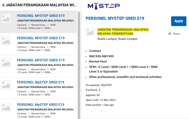 Permohonan jawatan ini boleh dibuat melalui Portal MyFutureJobs. Sila ke Portal MyFutureJobs dan Masukkan Kata Carian yang ingin dicari “JABATAN PERANGKAAN MALAYSIA WILAYAH PERSEKUTUAN” di bahagian carian untuk memohon jawatan yang diiklankan.