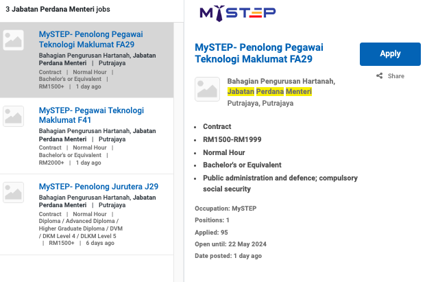 Permohonan jawatan ini boleh dibuat melalui Portal MyFutureJobs. Sila ke Portal MyFutureJobs dan Masukkan Kata Carian yang ingin dicari “Jabatan Perdana Menteri” di bahagian carian untuk memohon jawatan yang diiklankan.