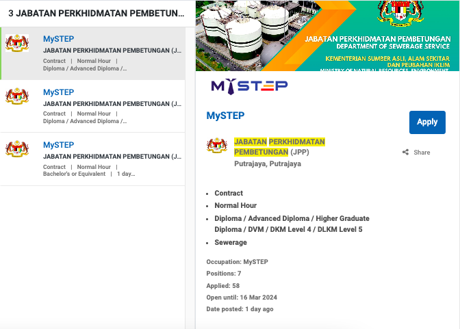 Permohonan jawatan ini boleh dibuat melalui Portal MyFutureJobs. Sila ke Portal MyFutureJobs dan Masukkan Kata Carian yang ingin dicari “JABATAN PERKHIDMATAN PEMBETUNGAN (JPP)” di bahagian carian untuk memohon jawatan yang diiklankan.