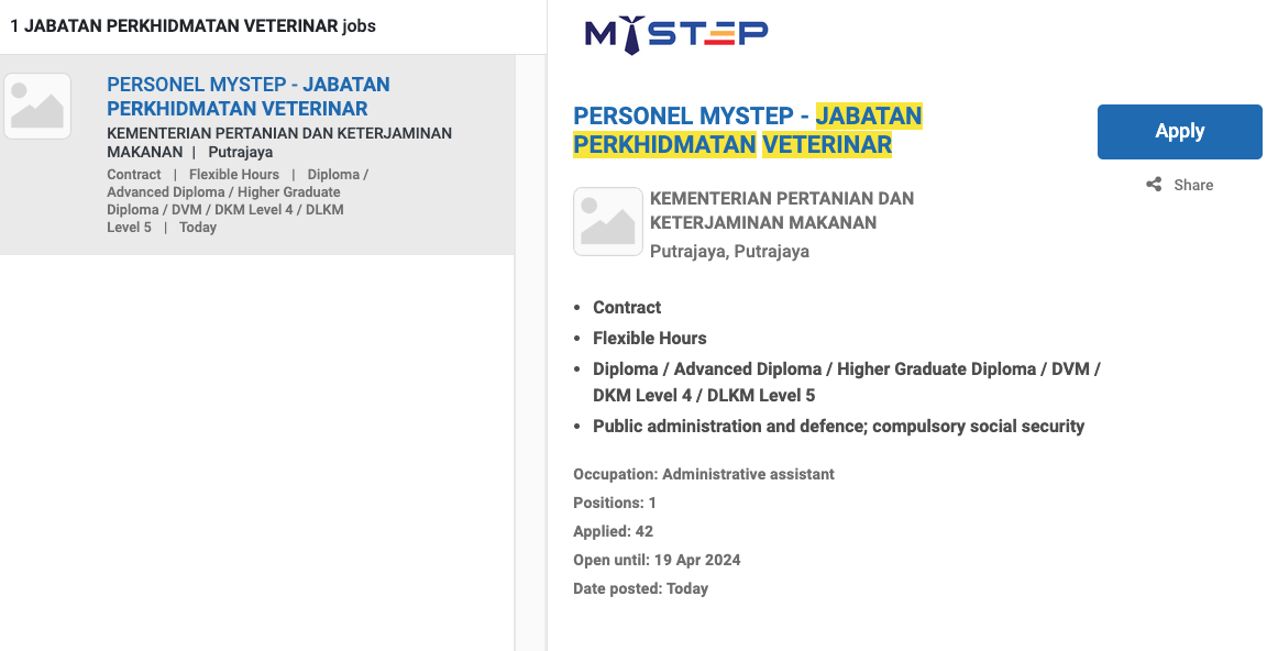 Permohonan jawatan ini boleh dibuat melalui Portal MyFutureJobs. Sila ke Portal MyFutureJobs dan Masukkan Kata Carian yang ingin dicari “JABATAN PERKHIDMATAN VETERINAR” di bahagian carian untuk memohon jawatan yang diiklankan.