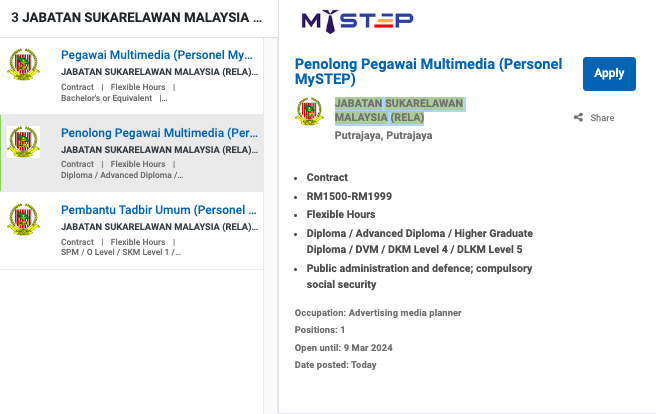 Permohonan jawatan ini boleh dibuat melalui Portal MyFutureJobs. Sila ke Portal MyFutureJobs dan Masukkan Kata Carian yang ingin dicari “JABATAN SUKARELAWAN MALAYSIA (RELA)” di bahagian carian untuk memohon jawatan yang diiklankan.