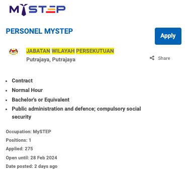 Permohonan jawatan ini boleh dibuat melalui Portal MyFutureJobs. Sila ke Portal MyFutureJobs dan Masukkan Kata Carian “JABATAN WILAYAH PERSEKUTUAN” di bahagian carian untuk memohon jawatan yang diiklankan.
