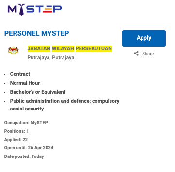 Permohonan jawatan ini boleh dibuat melalui Portal MyFutureJobs. Sila ke Portal MyFutureJobs dan Masukkan Kata Carian yang ingin dicari “JABATAN WILAYAH PERSEKUTUAN” di bahagian carian untuk memohon jawatan yang diiklankan.