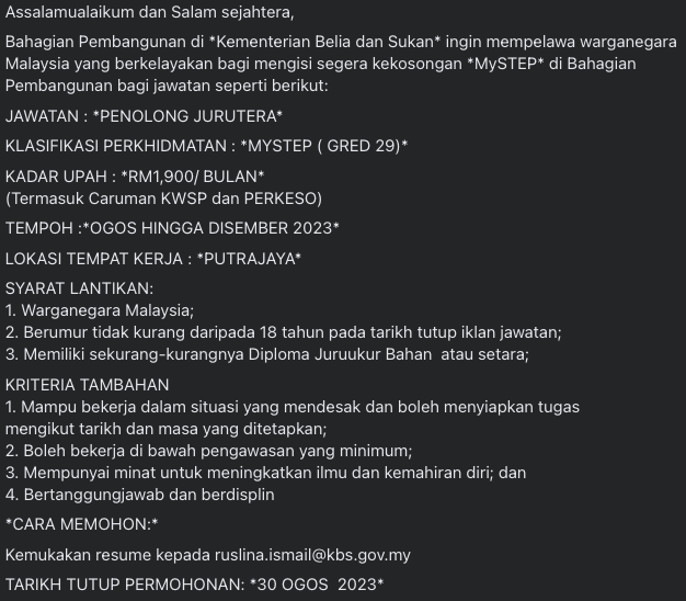 Iklan Jawatan Kementerian Belia dan Sukan