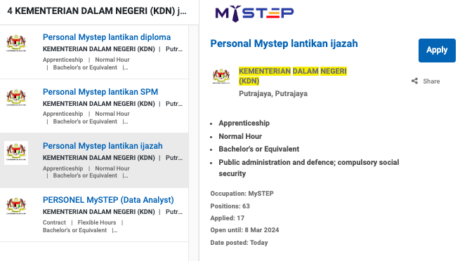 Permohonan jawatan ini boleh dibuat melalui Portal MyFutureJobs. Sila ke Portal MyFutureJobs dan Masukkan Kata Carian yang ingin dicari “KEMENTERIAN DALAM NEGERI (KDN)” di bahagian carian untuk memohon jawatan yang diiklankan.