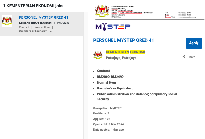 Permohonan jawatan ini boleh dibuat melalui Portal MyFutureJobs. Sila ke Portal MyFutureJobs dan Masukkan Kata Carian yang ingin dicari “KEMENTERIAN EKONOMI” di bahagian carian untuk memohon jawatan yang diiklankan.
