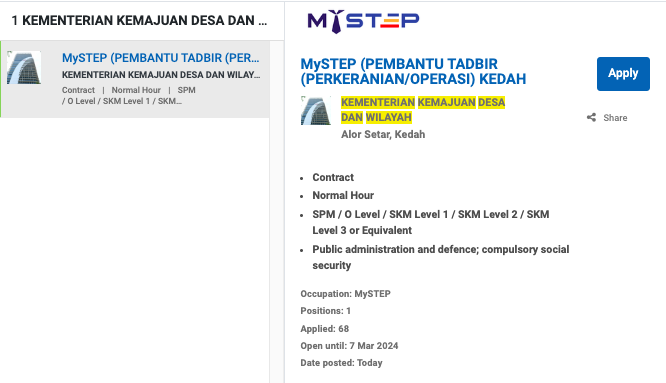 Permohonan jawatan ini boleh dibuat melalui Portal MyFutureJobs. Sila ke Portal MyFutureJobs dan Masukkan Kata Carian yang ingin dicari “KEMENTERIAN KEMAJUAN DESA DAN WILAYAH” di bahagian carian untuk memohon jawatan yang diiklankan.