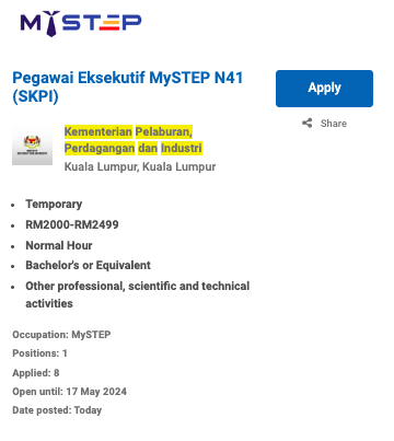 Permohonan jawatan ini boleh dibuat melalui Portal MyFutureJobs. Sila ke Portal MyFutureJobs dan Masukkan Kata Carian yang ingin dicari “Kementerian Pelaburan, Perdagangan dan Industri” di bahagian carian untuk memohon jawatan yang diiklankan.