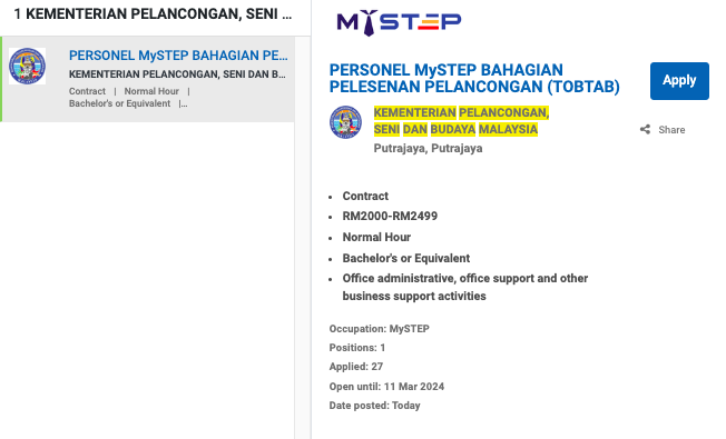 Permohonan jawatan ini boleh dibuat melalui Portal MyFutureJobs. Sila ke Portal MyFutureJobs dan Masukkan Kata Carian yang ingin dicari “KEMENTERIAN PELANCONGAN, SENI DAN BUDAYA MALAYSIA” di bahagian carian untuk memohon jawatan yang diiklankan.