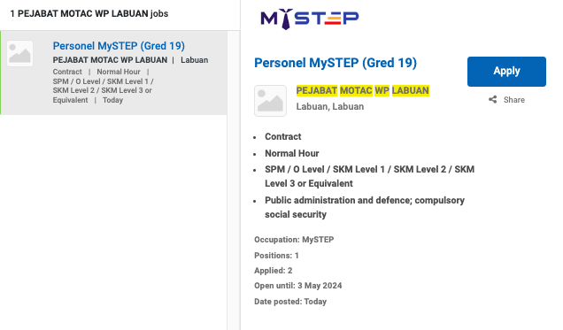 Permohonan jawatan ini boleh dibuat melalui Portal MyFutureJobs. Sila ke Portal MyFutureJobs dan Masukkan Kata Carian yang ingin dicari “PEJABAT MOTAC WP LABUAN” di bahagian carian untuk memohon jawatan yang diiklankan.