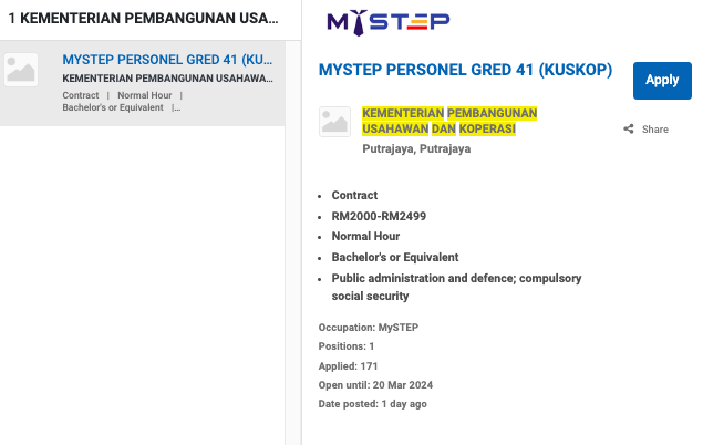 • Setelah mendaftar, anda boleh terus login dan mencari bidang kerjaya yang diinginkan mengikut lokasi yang ditawarkan
