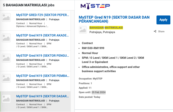Permohonan jawatan ini boleh dibuat melalui Portal MyFutureJobs. Sila ke Portal MyFutureJobs dan Masukkan Kata Carian “BAHAGIAN MATRIKULASI” di bahagian carian untuk memohon jawatan yang diiklankan.