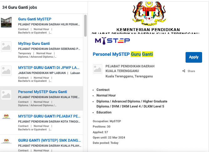 Permohonan jawatan ini boleh dibuat melalui Portal MyFutureJobs. Sila ke Portal MyFutureJobs dan Masukkan Kata Carian yang ingin dicari “ GURU GANTI” di bahagian carian untuk memohon jawatan yang diiklankan.