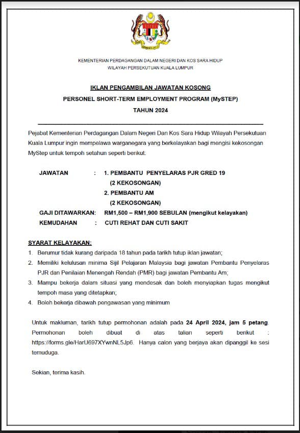 Iklan Jawatan Kementerian Perdagangan Dalam Negeri Dan Hal Ehwal Pengguna (KPDNHEP)