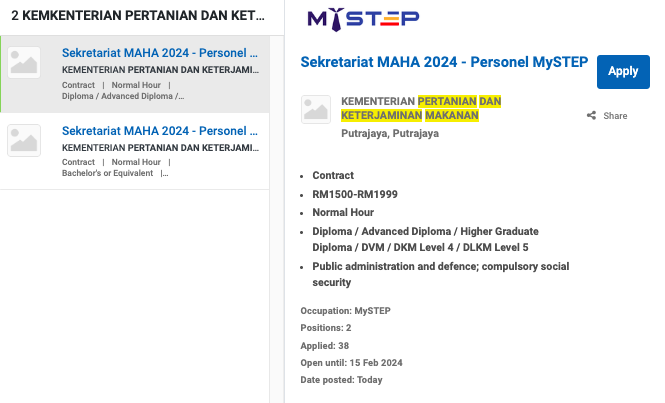 Permohonan jawatan ini boleh dibuat melalui Portal MyFutureJobs. Sila ke Portal MyFutureJobs dan Masukkan Kata Carian yang ingin dicari “KEMENTERIAN PERTANIAN DAN KETERJAMINAN MAKANAN di bahagian carian untuk memohon jawatan yang diiklankan.