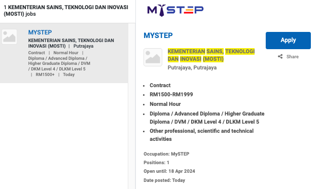 Permohonan jawatan ini boleh dibuat melalui Portal MyFutureJobs. Sila ke Portal MyFutureJobs dan Masukkan Kata Carian yang ingin dicari “KEMENTERIAN SAINS, TEKNOLOGI DAN INOVASI (MOSTI)” di bahagian carian untuk memohon jawatan yang diiklankan.