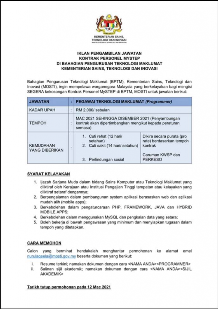 Iklan Jawatan Kementerian, Sains, Teknologi & Inovasi (MOSTI)