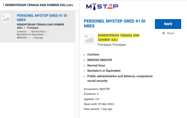 Permohonan jawatan ini boleh dibuat melalui Portal MyFutureJobs. Sila ke Portal MyFutureJobs dan Masukkan Kata Carian yang ingin dicari “KEMENTERIAN TENAGA DAN SUMBER ASLI” di bahagian carian untuk memohon jawatan yang diiklankan.