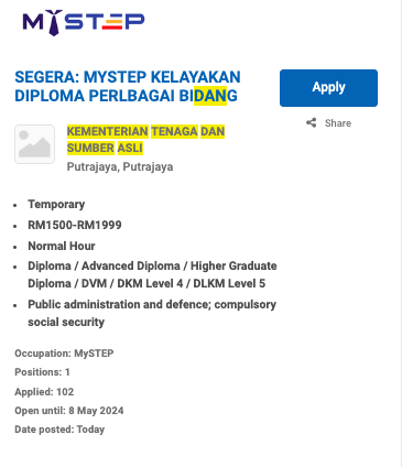 Permohonan jawatan ini boleh dibuat melalui Portal MyFutureJobs. Sila ke Portal MyFutureJobs dan Masukkan Kata Carian yang ingin dicari “KEMENTERIAN TENAGA DAN SUMBER ASLI” di bahagian carian untuk memohon jawatan yang diiklankan.