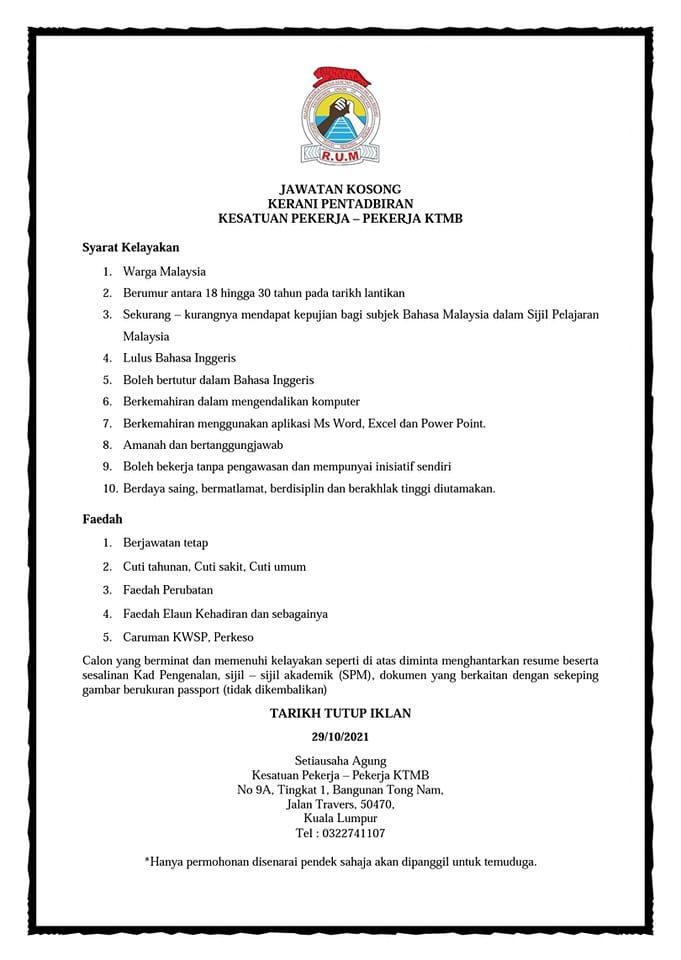 Iklan Jawatan Kesatuan Pekerja-Pekerja KTMB