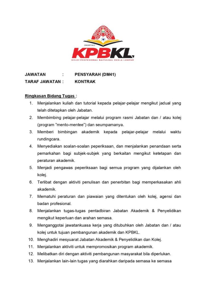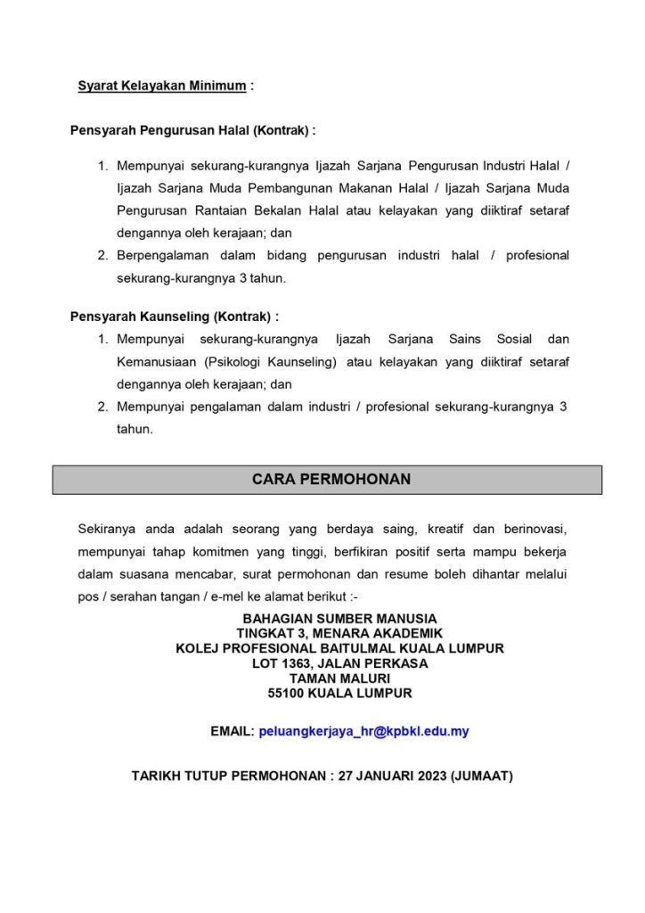 Iklan Jawatan Kolej Profesional Baitulmal Kuala Lumpur