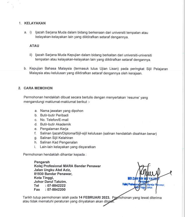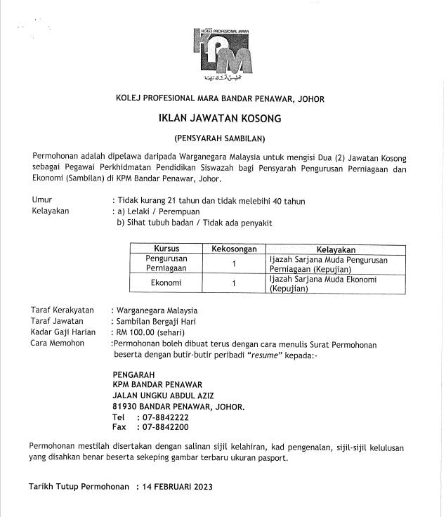 Iklan Jawatan Kolej Profesional MARA