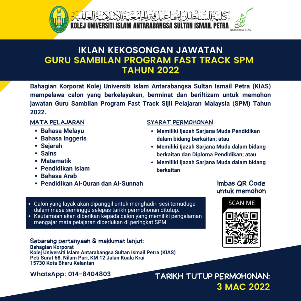 Iklan Jawatan Kolej Universiti Islam Antarabangsa Sultan Ismail Petra (KIAS)