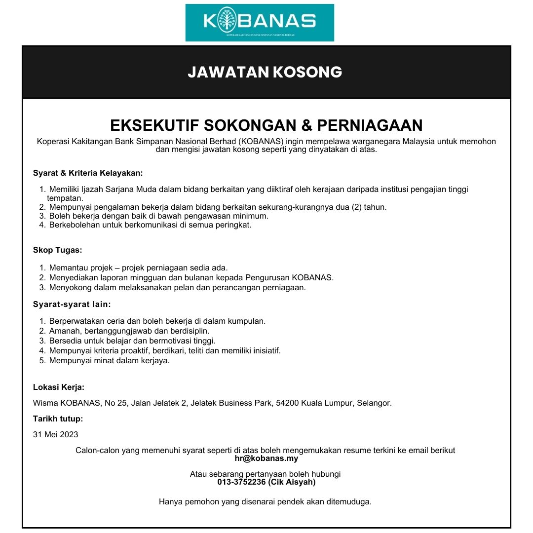 Iklan Jawatan Koperasi Kakitangan Bank Simpanan Nasional (KOBANAS)