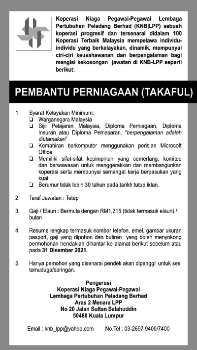 Iklan Jawatan Koperasi Niaga Pegawai-Pegawai Lembaga Pertubuhan Peladang Berhad