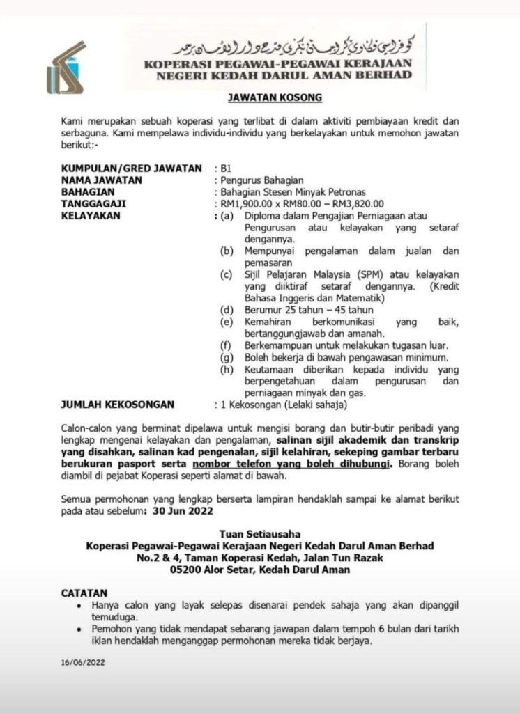 Iklan Jawatan Koperasi Pegawai-Pegawai Kerajaan Negeri Kedah Darul Aman Berhad